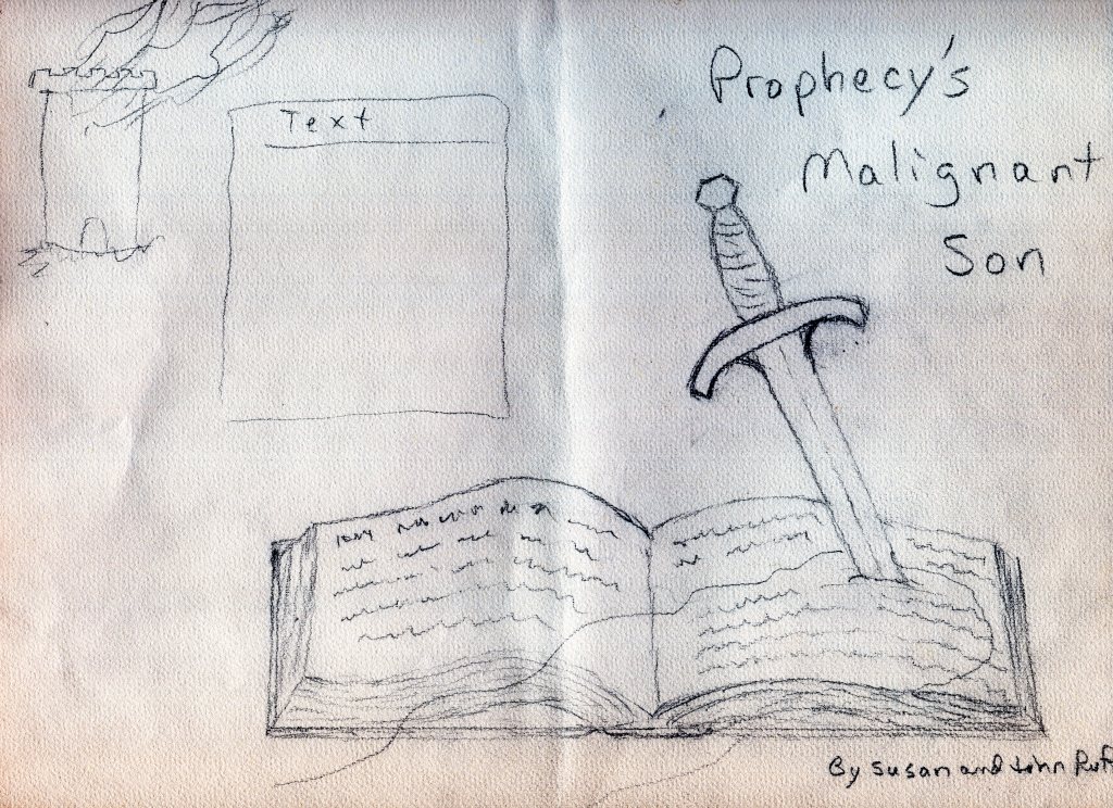A couple of weeks back, I started playing with some ideas for the cover. The rough sketch above represents one of the ideas I had. I am currently talking with an artist friend about possible cover art. For those of you who read 60th Hour, you know the cover art on that book was pretty abstract. To produce it, I played with variations on a photograph I had taken of a state capital rotunda. That was fine for the initial edition of our first published book, but this time I’d like something a little more “fantasy” looking. Depending on how things go with the cover for Prophecy’s Malignant Son, I may also commission some cover art when we put out the revised edition of 60th Hour (to correct all those little formatting oddities that I mentioned in an earlier blog post).