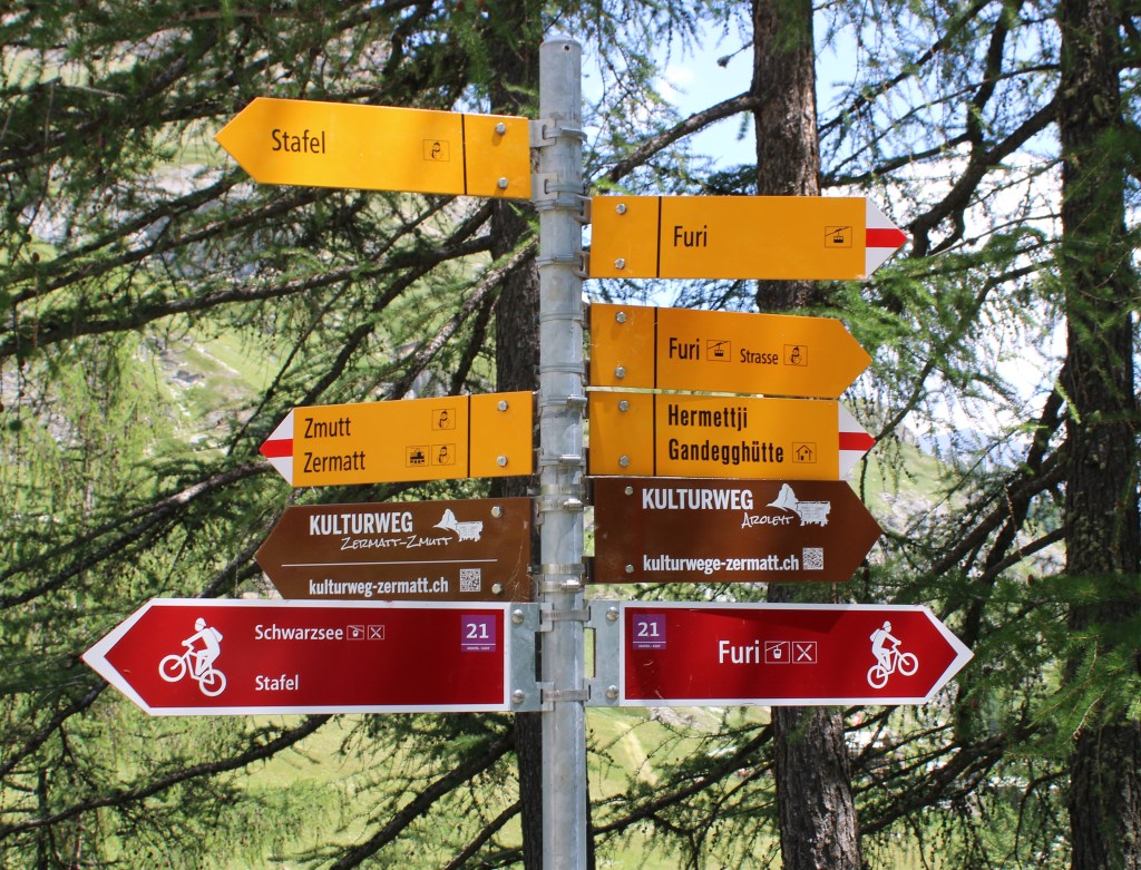 During my recent trip to Switzerland, I decided to hike up part of the Matterhorn Trail to the place where I could catch the gondola ride back down to town. Leaving from Zermatt with my little guidebook map, I quickly learned that the trails were extensive, well-maintained, and marked with excellent signs to tell where the various routes led. The only thing lacking from some of the signs was the distance to each of the listed destinations.