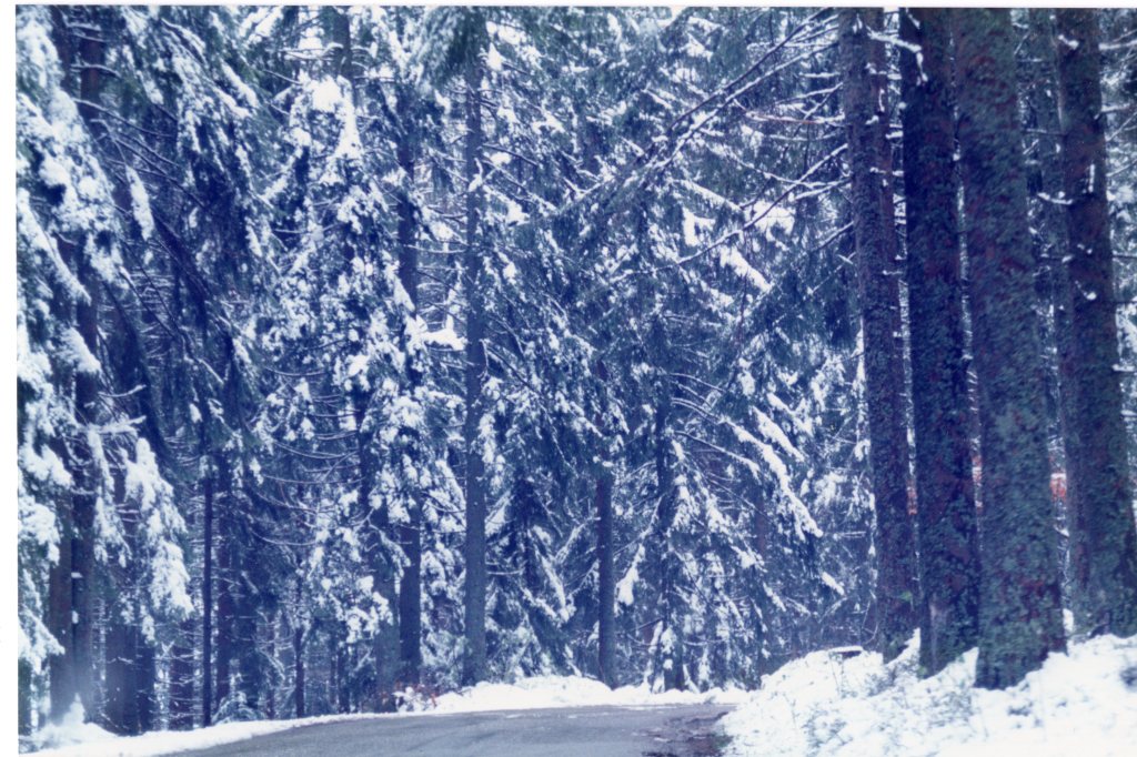 Our unexpected detour led us through a beautiful section of the forest, with snow drifting down from the tree branches. (The faded photo scanned from my photo album doesn’t even begin to capture the loveliness of the scene.) When we eventually arrived safely at our destination, the unexpected excursion became one of the highlights of the trip. We still talk about it, even 30 years later.