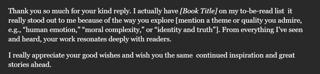 I just wanted to reach out to say how much I admired your work. It’s inspiring to see writing that’s both fearless and artful.”